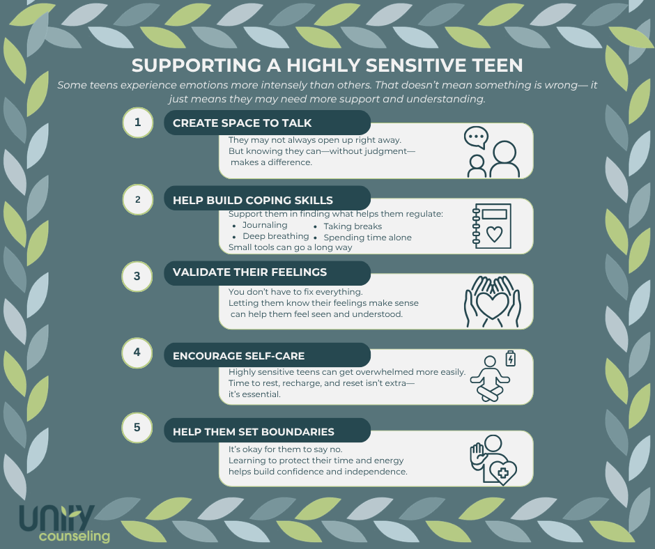 Also, letting your teen know that being highly sensitive can be both a strength and a challenge can make them feel more secure in their identity. It's important to remind them that what makes them unique can be used as a personal growth and understanding tool. It can help them recognize their feelings and healthily process them.