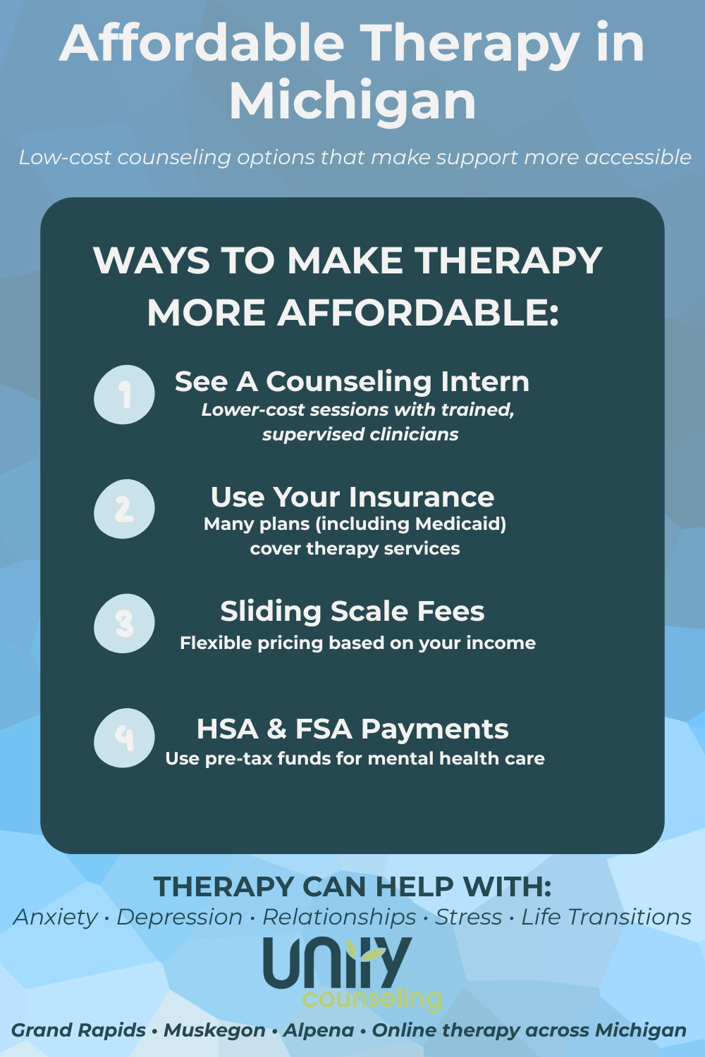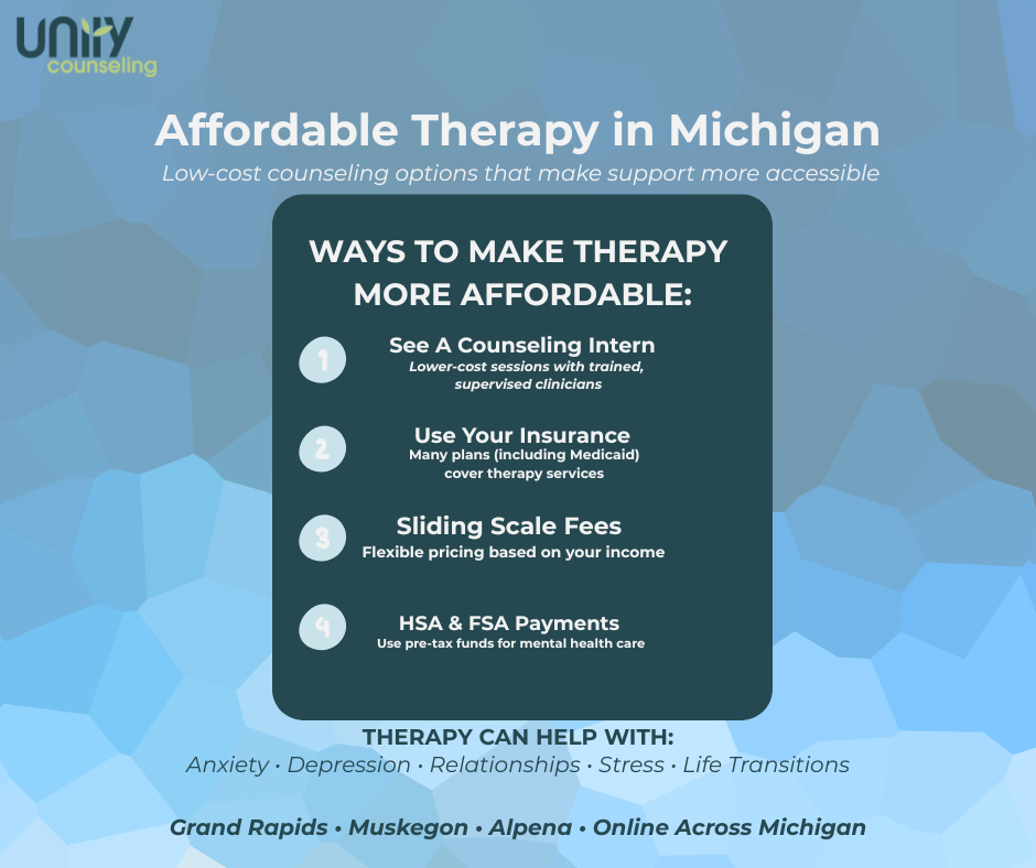 Prioritizing your mental health should never be compromised by financial concerns. Unity Counseling in Grand Rapids, MI, and throughout Michigan offers a wide array of affordable mental health counseling options. Whether you choose to work with interns, take advantage of our sliding scale fees, utilize insurance coverage, or pay with your Health Savings Account or Flexible Spending Account, Unity Counseling is here to support you on your journey to better mental health. Contact us today and take the first step toward a happier and healthier you.