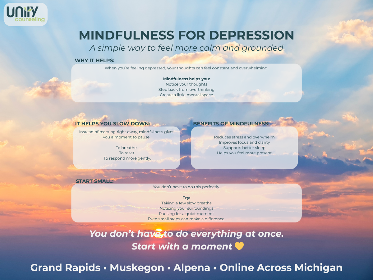 Mindfulness is one of the ways to improve mental health and treat depression, but our team of specialized therapists will be able to provide the best course of treatment for you. At Unity Counseling, we understand that every individual is unique and requires a personalized approach to create lasting change. We are happy to offer support from our Michigan-based therapy practices in Grand Rapids, MI and Alpena, MI.
