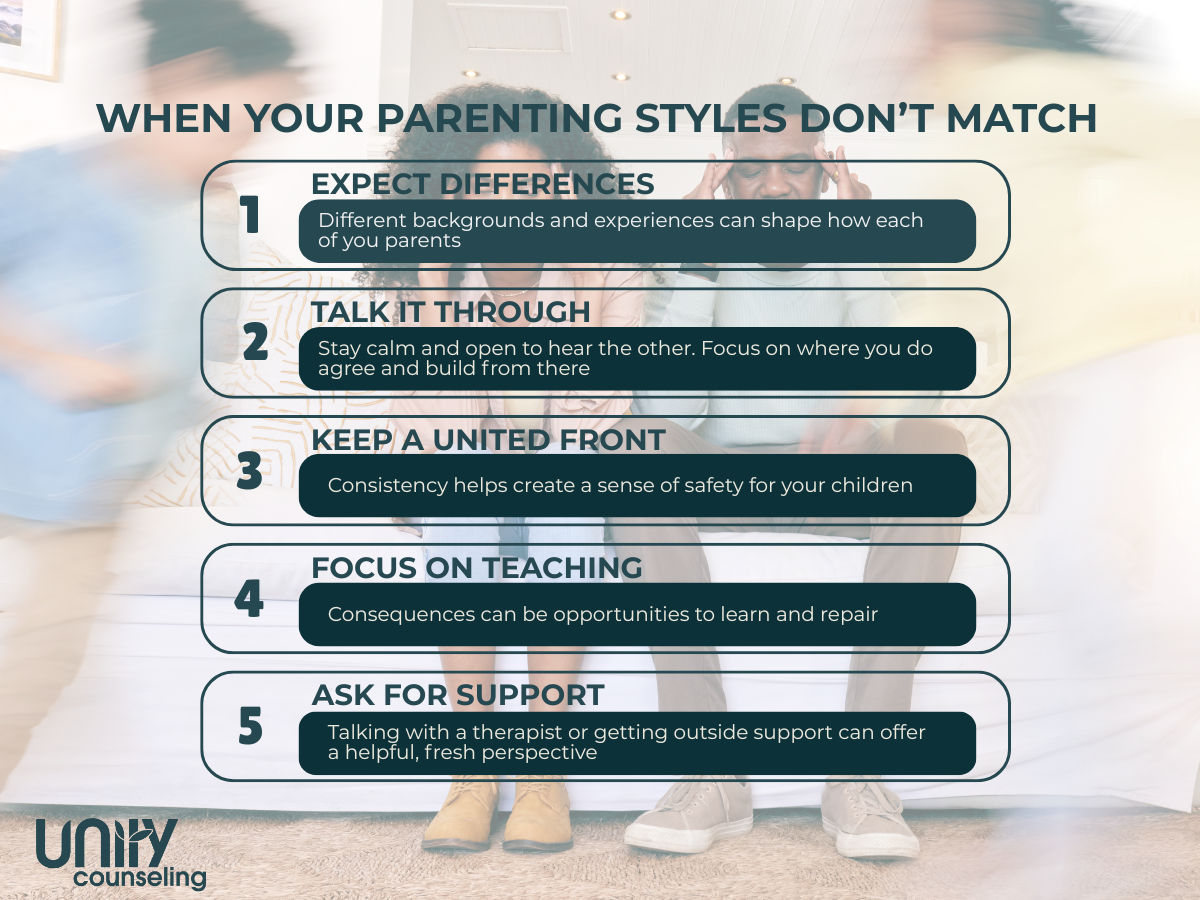 First, accept that it is natural to disagree on parenting approaches from time to time. Each of us comes from a somewhat different background, has a different temperament, and has differing opinions on how to parent. Approaching the topic of parenting differences with a sense of curiosity can reduce defensiveness.