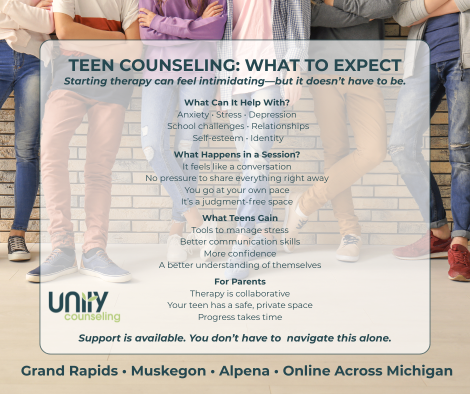 Counseling for teens isn’t the only service offered at Unity Counseling. Our team offers a variety of services to support you through the difficulties life may throw your way. We are happy to offer a variety of mental health services to support clients. These services include anxiety counseling, depression counseling, and grief counseling. We also offer services including couples counseling, LGBTQ+ affirming counseling, CBT, EMDR, and mindfulness. We understand making in-person appointments can be difficult at times. So, we are happy to also offer online therapy across Michigan. Feel free to learn more about us by visiting our blog or FAQ today!