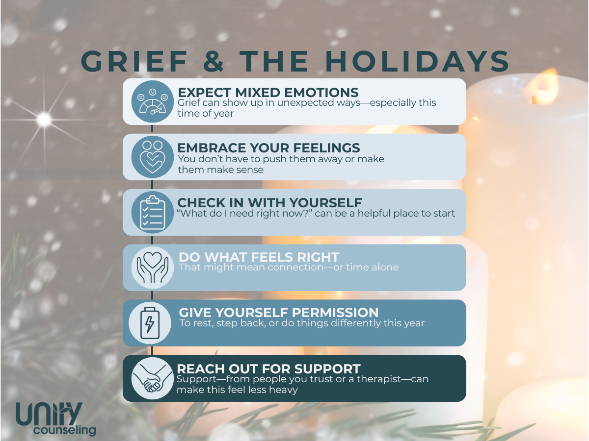 The holidays are known to be a difficult period for those struggling with grief. It is no surprise to us that those who have recently lost an important person in their lives struggle to make it through the holidays. When we have lost a spouse, parent, partner, child, grandparent, good friend, pet, job, or a life’s dream, the holidays provide a stark contrast to the sadness. And, other grief-related feelings we may hold inside.