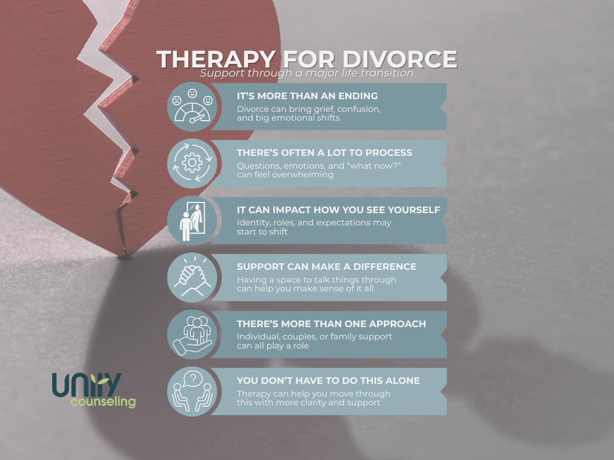 Therapy offers individuals powerful coping skills that can help them navigate their overwhelming thoughts and feelings. Therapy offers a safe space to explore and share your feelings so you can make sense of them yourself. It’s a way for people to have a healthier outlook on their divorce and become empowered during a very difficult time.